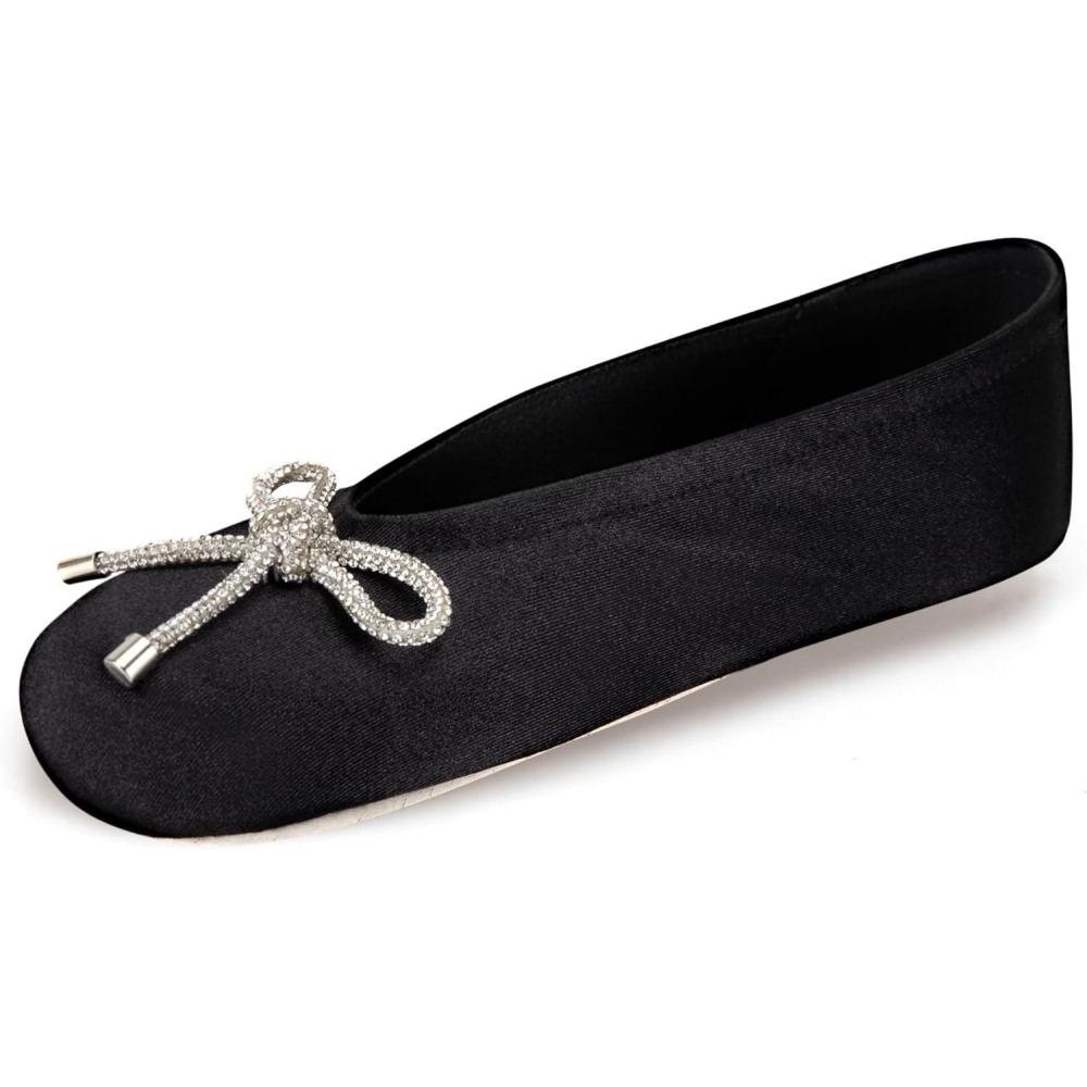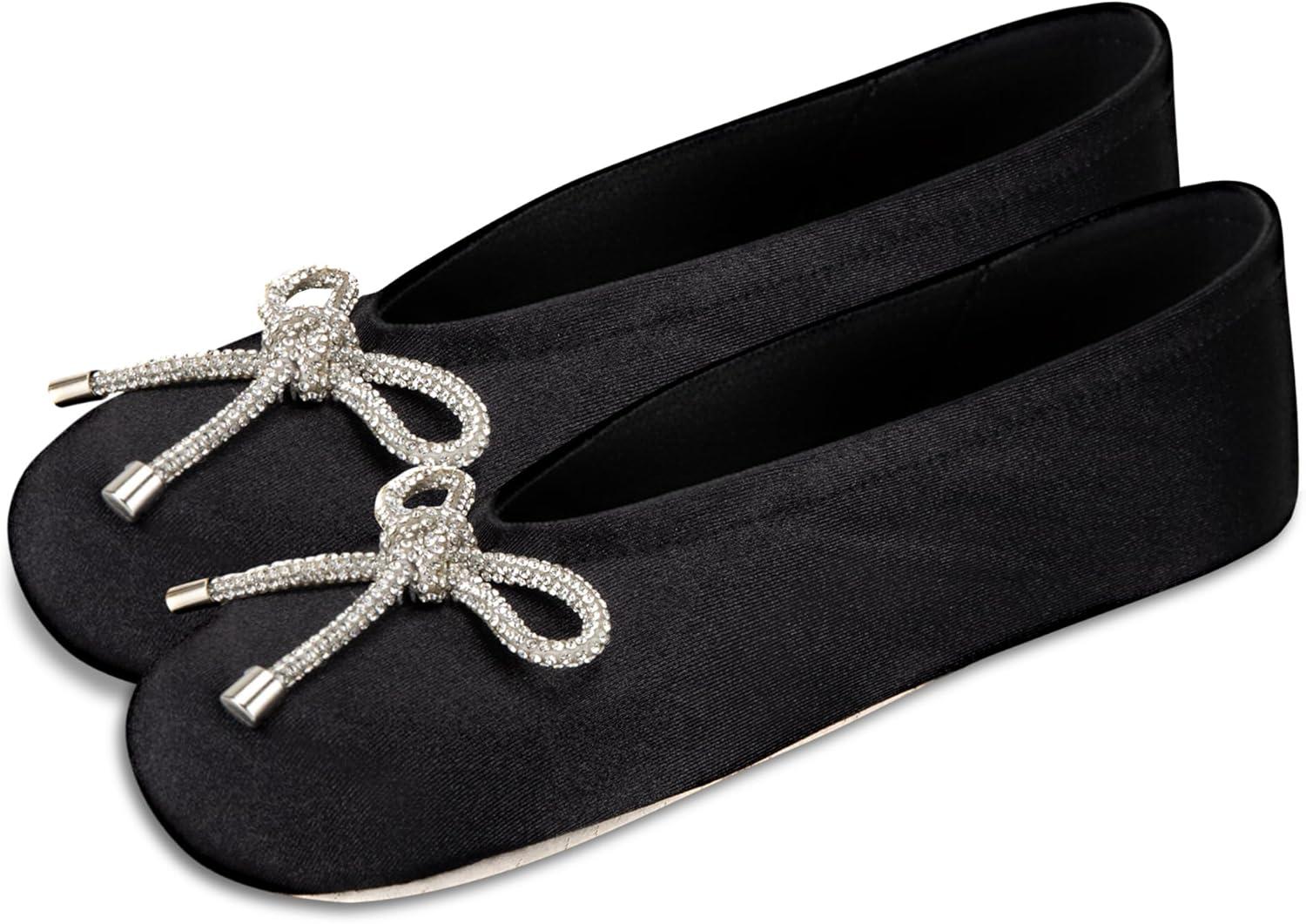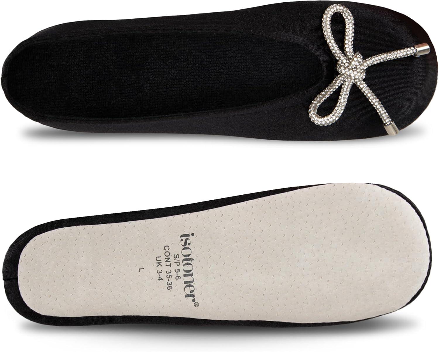 ISOTONER SATIN BALLERINA SLIPPER: Classic, timeless and supremely soft, isotoner ballerina slippers never go out of style. Transporting your feet to a relaxing spa with every step, these feminine ballet slippers for women are made with luxurious stretch satin for chic style and the perfect comfort fit. A super-soft cotton-blend terry provides breathability and cozy comfort all year round, and the lightweight women’s slippers are finished with an Isoflex comfort insole that conforms with your feet, and a genuine suede outsole for improved durability. Perfectly pretty for relaxing at home, these satin slippers are also ideal for weddings and events, and are a favorite with bridal parties. Simply fold the flexible travel slippers and toss them in your purse if you think your feet are in for a tough day – when your pumps start to pinch, just slip them off and replace them with these cushioned indoor shoes for ultimate comfort. The luxurious satin fabric and bow maintain your elegant look, and your sore, tired feet will thank you! The satin indoor slippers feature 4-way stretch fabric and an elasticized topline, and the comfy slippers are easy to keep hygienically clean, however much you wear them. When your new favorite slipper shoes need refreshing, just place them in the washing machine in cool water and dry flat away from heat. They will look and feel as good as new. This woman’s slipper runs small, so we recommend ordering the next size up for the most comfortable and flexible fit. For perfect pirouettes around the house, check out ISOTONER's Classic Satin slipper. This sweet offering in fabric boasts a cushioned insole for comfort and an elasticized topline for a secure fit. Machine washability ensures easy wear.