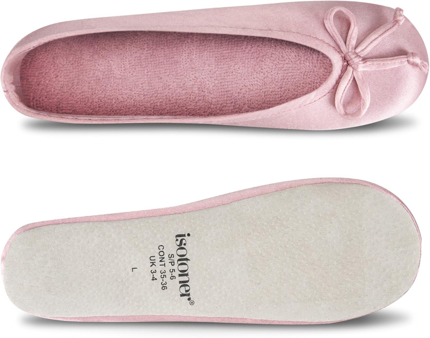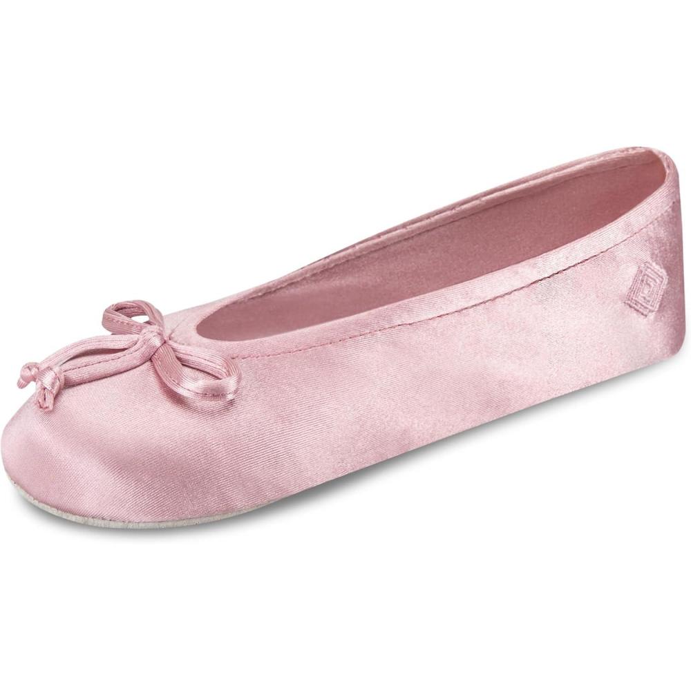 ISOTONER SATIN BALLERINA SLIPPER: Classic, timeless and supremely soft, isotoner ballerina slippers never go out of style. Transporting your feet to a relaxing spa with every step, these feminine ballet slippers for women are made with luxurious stretch satin for chic style and the perfect comfort fit. A super-soft cotton-blend terry provides breathability and cozy comfort all year round, and the lightweight women’s slippers are finished with an Isoflex comfort insole that conforms with your feet, and a genuine suede outsole for improved durability. Perfectly pretty for relaxing at home, these satin slippers are also ideal for weddings and events, and are a favorite with bridal parties. Simply fold the flexible travel slippers and toss them in your purse if you think your feet are in for a tough day – when your pumps start to pinch, just slip them off and replace them with these cushioned indoor shoes for ultimate comfort. The luxurious satin fabric and bow maintain your elegant look, and your sore, tired feet will thank you! The satin indoor slippers feature 4-way stretch fabric and an elasticized topline, and the comfy slippers are easy to keep hygienically clean, however much you wear them. When your new favorite slipper shoes need refreshing, just place them in the washing machine in cool water and dry flat away from heat. They will look and feel as good as new. This woman’s slipper runs small, so we recommend ordering the next size up for the most comfortable and flexible fit. For perfect pirouettes around the house, check out ISOTONER's Classic Satin slipper. This sweet offering in fabric boasts a cushioned insole for comfort and an elasticized topline for a secure fit. Machine washability ensures easy wear.